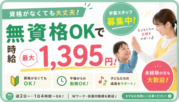 学童保育スタッフ/無資格OK!/週4日から相談OK!/無料駐車場あり!!/子どもが好きな方・子育て経験を活かしたい方歓迎♪