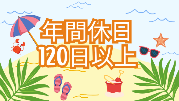 土曜、日曜、祝日 土日祝日はお休みです! 年間休日120日以上 年末年始休暇 お盆休みあり |