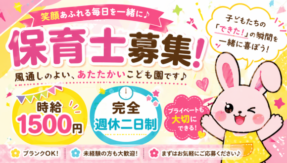 施設形態 私立認可保育園 住所 京都府 京都市 左京区高野東開町1‐3 雇用形態 派遣社員 給与 時給 1,400円~1,450円