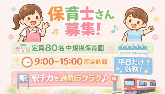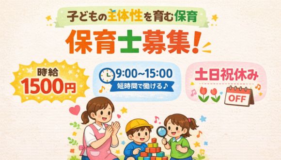 保育士/時給1500円/土日祝休み/時間帯相談できます/固定勤務/ 残業持ち帰りなし/子育てにも理解のあるこども園