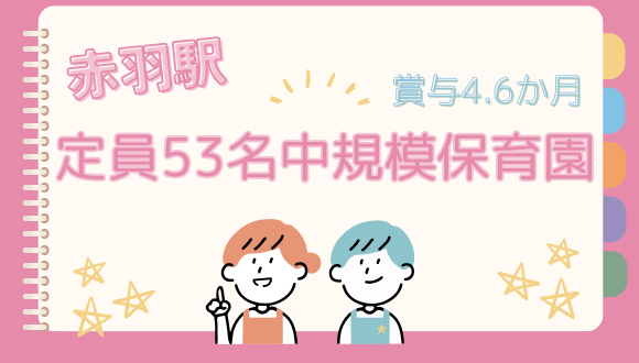 保育士/認可保育園【賞与4.6か月】定員53名/年休123日以上/遅番18:45まで/週休二日制赤羽駅最寄り/給食あり