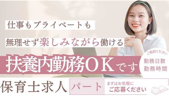 保育士/土日祝休み/ピアノ・書き物なし/有給消化率100%/残業なし/休みがとりやすい◎/片免OK/パート