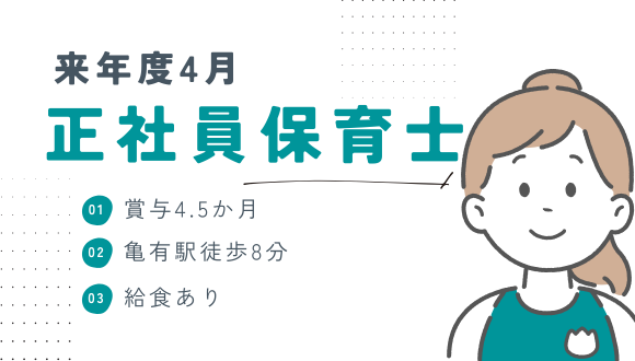 賞与: 年3回 / 合計4.4ヶ月資格 保育士 - 未経験OK