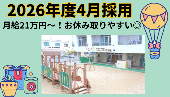 保育士【月給21万円~】2026年度4月採用/正社員/賞与2.5カ月/お休み相談もしやすい環境/ライフワークバランスを重視したい方にオススメです♪