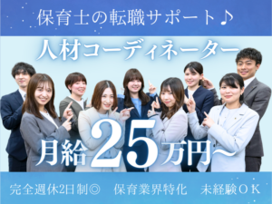 保育専門の人材コーディネーター/月給25万以上/髪色ネイル自由/土日祝休み/年間休日125日以上...